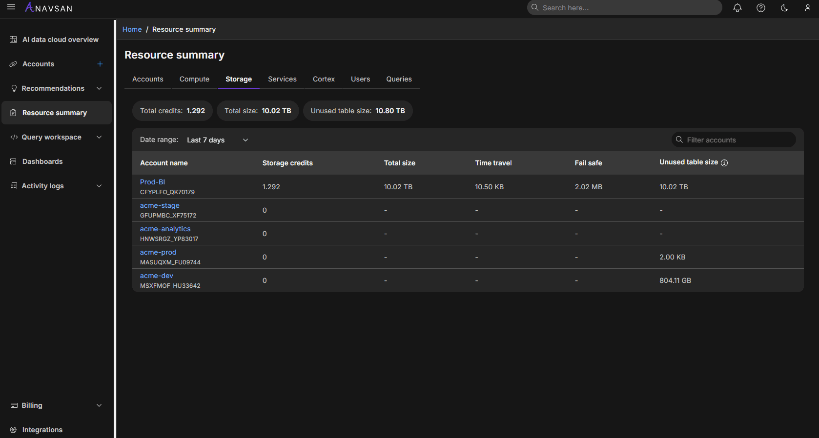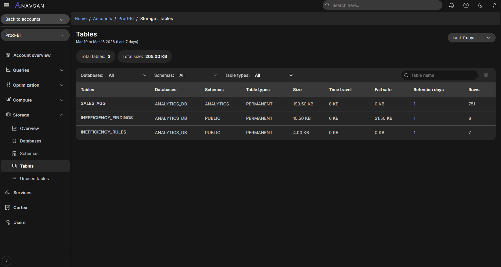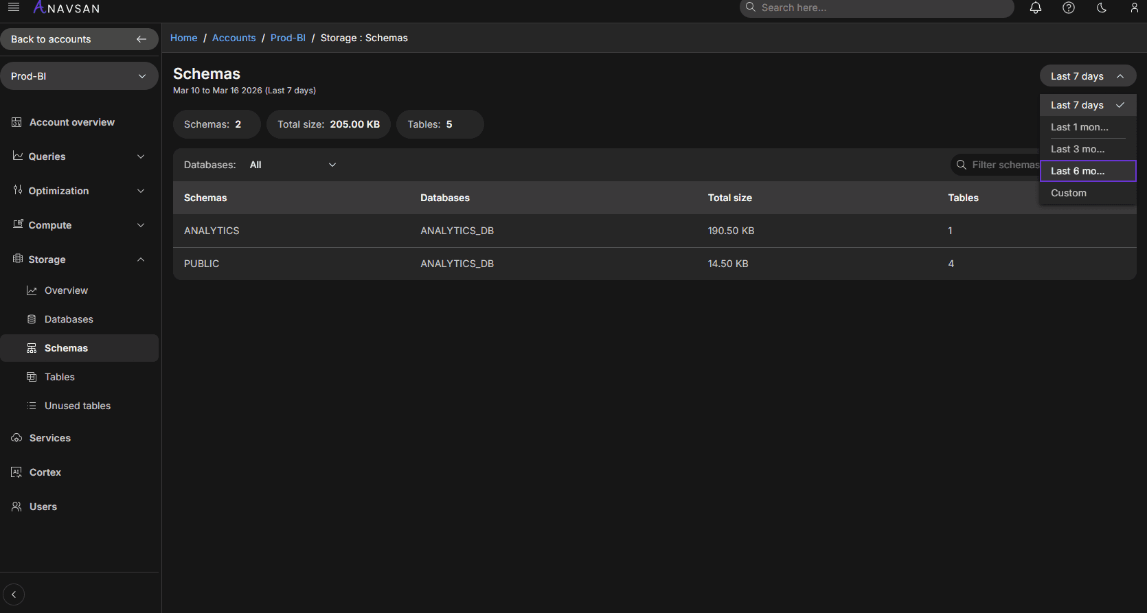 Anavsan Storage Insights provides a unified, interactive view of storage usage across your Snowflake environment.