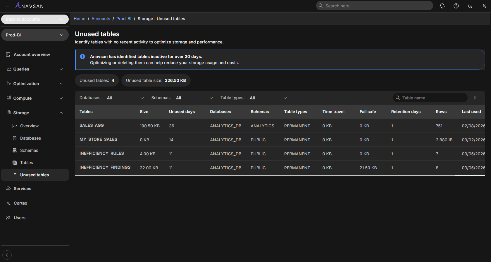 Storage Insights automatically identifies tables that have been inactive for more than 30 days.