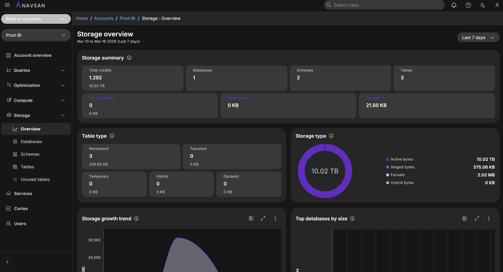 This provides an immediate understanding of the overall storage footprint across your Snowflake environment.